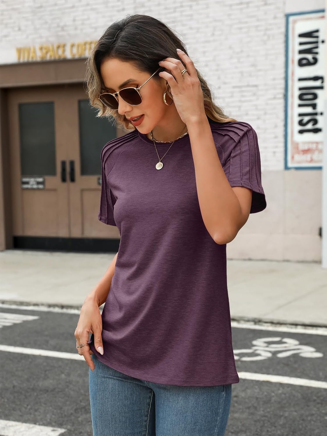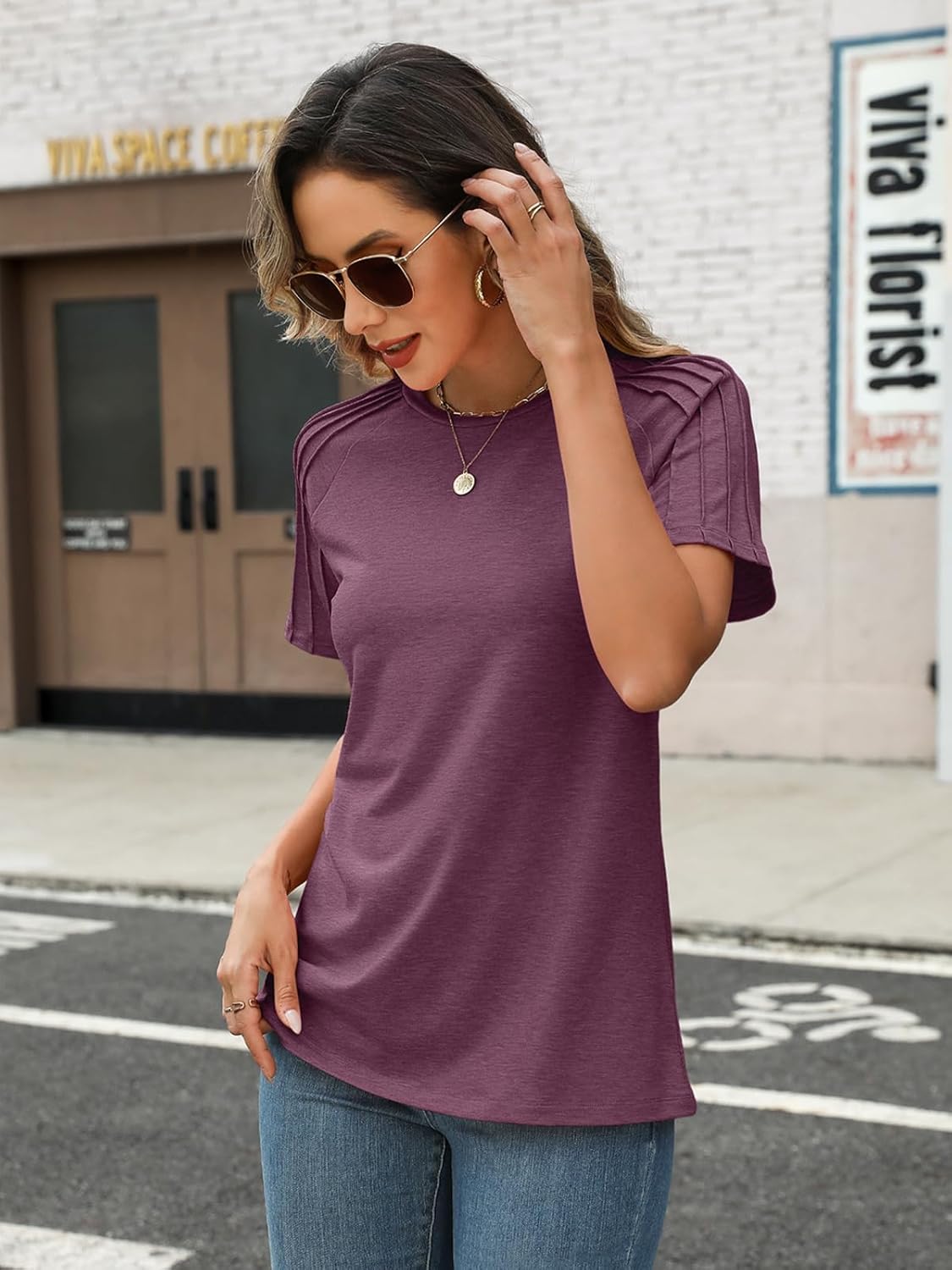 Short sleeve tops for women ,unique pleated sleeve designed, cotton blend fabric and loose fit design, complete a casual and super cute look.